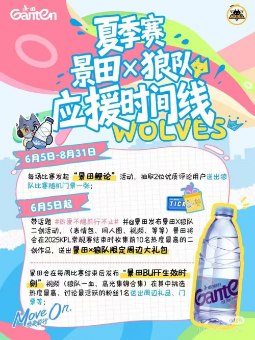 2024年,景田正式官宣成为KPL年度官方合作伙伴,并荣膺赛事指定饮用水称号。这让景田快速融入电竞核心圈层,从选手桌上的矿泉水瓶到直播画面的高频次露出,“健康补水”的品牌理念贯穿于整个赛事链条。此外,景田还签约十冠战队重庆狼队,以独家赞助身份将“热爱前行”的品牌主张与战队拼搏精神深度结合。这种“双向绑定”的合作模式,不仅强化了景田在电竞圈层内的影响力,也通过战队的成功故事进一步拉近了品牌与年轻消费者之间的距离。