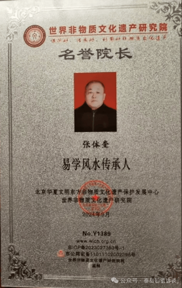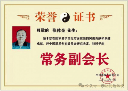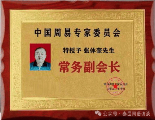 张体奎,男,汉族,1962年2月生于河南省太康县毛庄镇西张行政村人,大专学历。太康县伏義文化研究会会长,淮阳伏羲文化研究会副会长,中国周易专家委员会常务副会长,世界非物质文化研究院名誉院长,张体奎老师刻苦钻研易学之理终有大成;他矢志创新反复实践,正心存善尤擅以易学点化度人;为师悉心不掖其瑜常能使人醍醐灌顶。传承国学文化,获得过多项国家级行业荣誉奖项,特授予担任“中国周易专家委员会常务副会长”。