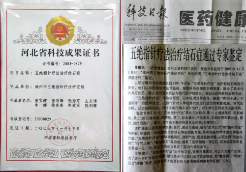 他还参与完成了《五绝指针疗法治疗结石症》课题研究,经河北省科技厅鉴定达“国际领先水平”。